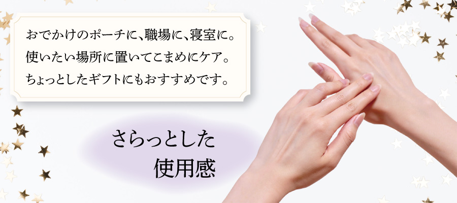 さらっとした使用感。おでかけのポーチに、職場に、寝室に。使いたい場所に置いてこまめにケア。ちょっとしたギフトにもおすすめです。