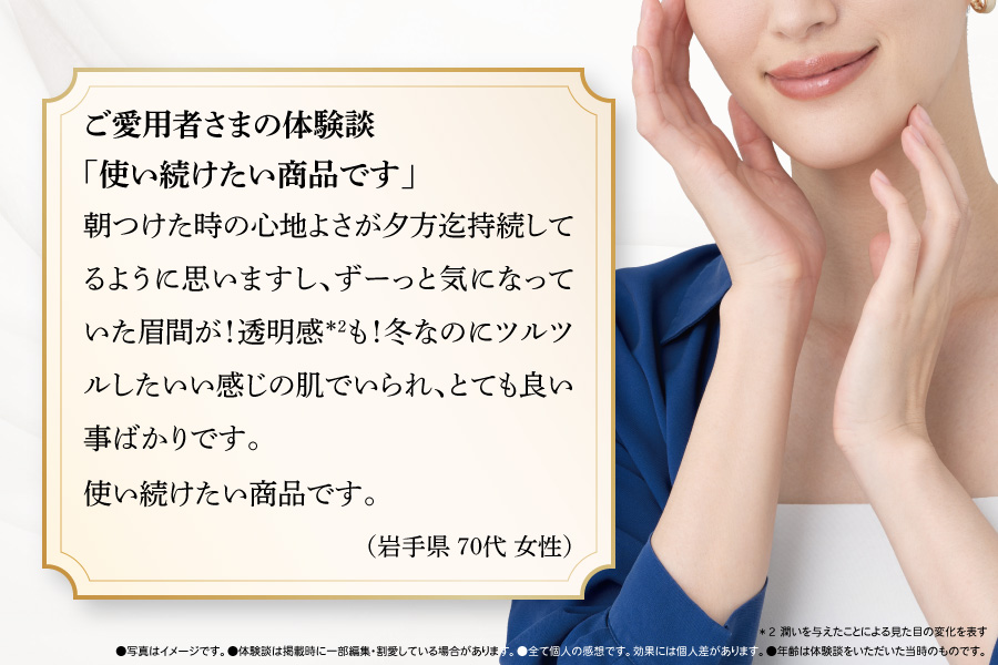朝つけた時の心地よさが夕方迄持続してるように思いますし、ずーっと気になっていた眉間が!透明感*2も!冬なのにツルツルしたいい感じの肌でいられ、とても良い事ばかりです。使い続けたい商品です。(岩手県 70代 女性)