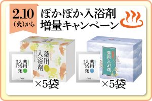 【ぽかぽか入浴剤増量キャンペーン】 日頃のご愛顧に感謝して薬用入浴剤バスメニー、薬用入浴剤バスホワイトをご購入ごとに5袋プレゼント! お家で温泉気分を楽しめるポカポカ入浴剤で、寒い冬を乗り越えましょう。