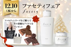 【ファセティフェア】 ファセティシリーズのローション、クリーム、それぞれをご購入で冬の素敵なアイテムをプレゼントいたします。 ローションをご購入の方へ、『英字柄軽量バッグ』をプレゼント。 クリームをご購入の方へ、『今治マフラー(日本製)』をプレゼント。